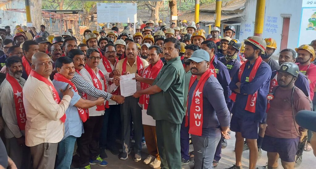 ఆర్.కె న్యూస్, నస్పూర్:  శ్రీరాంపూర్ ఏరియాలో ని ఆర్కే5 గని కార్మికులు ఎదుర్కొంటున్న పలు సమస్యలపై గని మేనేజర్ అబ్దుల్ ఖదీర్ కు ఏఐటీయూసీ నాయకులు మంగళవారం వినతి పత్రం అందజేశారు. ఈ సందర్భంగా ఏఐటీయూసీ నాయకులు మాట్లాడుతూ నూతన ఎస్.డి.ఎల్ యంత్రాలను అందుబాటులోకి తీసుకురావాలని, యాజమాన్యం కార్మికుల పై పని భారం తగ్గించాలని, క్యాంటీన్ లో మెనూ ప్రకారం నాణ్యమైన టిఫిన్స్ ఉద్యోగులకు అందించాలని, షిఫ్టులలో పనిచేసే ఎలక్ట్రిషన్, ఫిట్టర్స్ హెల్పర్స్ ఇవ్వాలని, సపోర్ట్ మెన్లకు అవసరమైన పనిముట్లు పని స్థలాల్లో అందుబాటులో ఉంచాలని, పని స్థలాల్లో సరైన గాలి ఉండేలా చర్యలు చేపట్టాలని, ఉద్యోగులకు వారి అవసరాన్ని బట్టి సెలవులు మంజూరు చేయాలని, మ్యాన్ రైడింగ్ ను ఉదయం 9 గంటల వరకు నడపాలని అన్నారు. కార్మికుల సమస్యల పరిష్కారానికి కృషి చేస్తానని గని మేనేజర్ హామీ ఇచ్చారు. ఈ కార్యక్రమంలో ఏఐటీయూసీ డిప్యూటీ జనరల్ సెక్రటరీలు కే. వీరభద్రయ్య, ముస్కె సమ్మయ్య, బ్రాంచ్ కార్యదర్శి షేక్ బాజీ సైదా, ఏరియా కార్యదర్శి ప్రసాద్ రెడ్డి, క్లరికల్ నాయకులు బద్రి బుచ్చయ్య, పిట్ కార్యదర్శి గునిగంటి నర్సింగరావు, పిట్ ఉపాధ్యక్షులు మల్లేష్, నాయకులు జిపి రావు, రాజయ్య తదితరులు పాల్గొన్నారు.