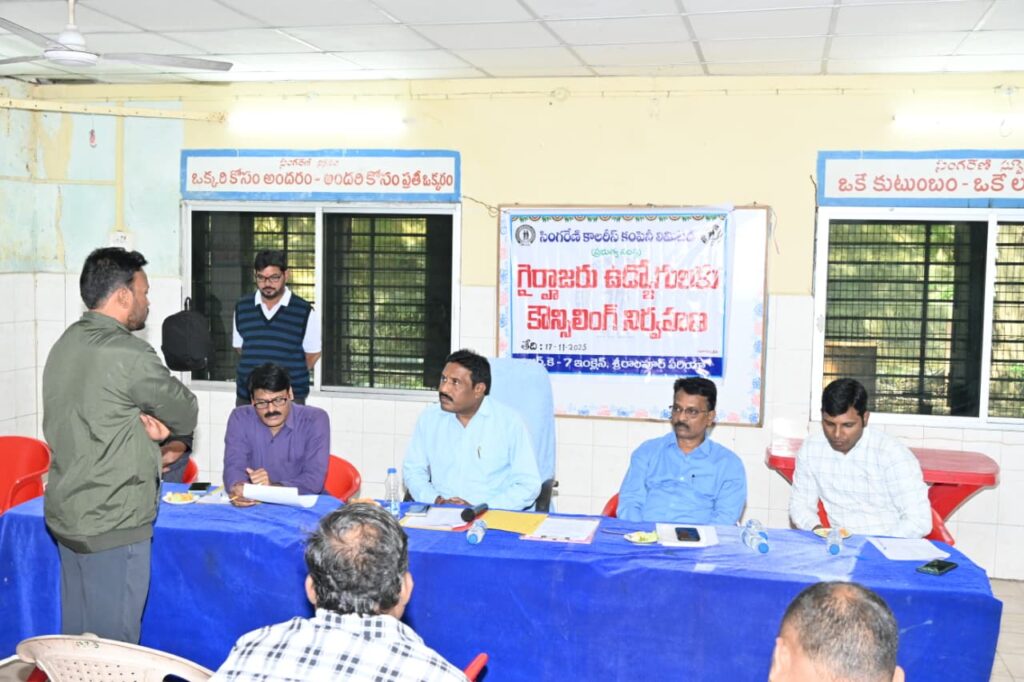నస్పూర్, ఆర్.కె న్యూస్: గైర్హాజరు ఉద్యోగులు తమ హాజరు శాతాన్ని మెరుగుపరుచుకుని, సింగరేణి పురోభివృద్ధిలో భాగస్వాములు కావాలని శ్రీరాంపూర్ జనరల్ మేనేజర్ మునిగంటి శ్రీనివాస్ అన్నారు. సోమవారం ఏరియాలోని ఆర్.కె 7 గనిలో ఈ ఏడాది జనవరి నుంచి అక్టోబర్ వరకు 150 మస్టర్లు చేయని ఉద్యోగులకు శ్రీరాంపూర్ జనరల్ మేనేజర్ మునిగంటి శ్రీనివాస్ ఆధ్వర్యంలో కౌన్సిలింగ్ నిర్వహించారు. ఈ సందర్భంగా శ్రీరాంపూర్ జనరల్ మేనేజర్ మాట్లాడుతూ, ప్రస్తుత పరిస్థితుల్లో సింగరేణి సంస్థలో ఉద్యోగం రావడం అదృష్టమని, గతంలో ఉన్న పరిస్థితులు ప్రస్తుతం లేవని, హాజరు శాతాన్ని పెంచుకోవాలని గైర్హాజరు ఉద్యోగులు సూచించారు. సింగరేణి సంస్థ కల్పిస్తున్న సదుపాయాలు ఇతర ఏ సంస్థలలో లేవని, ఈ అవకాశాన్ని సద్వినియోగం చేసుకుని ఉద్యోగులు ప్రతి నెల 20 పైన మస్టర్లు చేయాలని సూచించారు. ప్రతి ఒక్కరికి సమస్యలు ఉంటాయని, విధులకు హాజరు కాకపోతే సమస్యలు పెరిగి ఆర్థిక ఇబ్బందులు తలెత్తుతాయని, ఉద్యోగం పోతే మళ్ళీ రావడానికి కష్టమవుతుందని, ప్రస్తుత పరిస్థితుల్లో ప్రతి ఒక్కరూ విధులకు తప్పనిసరిగా హాజరవుతూ వారికి కేటాయించిన ఎనిమిది గంటల పనిని రక్షణతో చేయాలని పేర్కొన్నారు. ఈ కార్యక్రమంలో ఆర్.కె 7 గ్రూప్ ఏజెంట్ కుర్మ రాజేందర్, గని మేనేజర్ జె. తిరుపతి, గని సంక్షేమాధికారి శంతన్, పిట్ కార్యదర్శి మారెపల్లి సారయ్య తదితరులు పాల్గొన్నారు.