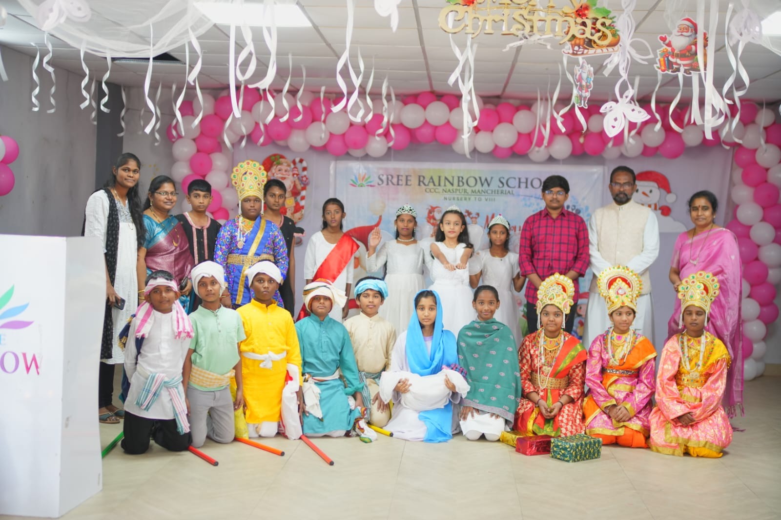 నస్పూర్, ఆర్.కె న్యూస్: స్థానిక రెయిన్ బో పాఠశాలలో బుధవారం క్రిస్మస్ ముందస్తు వేడుకలు అత్యంత వైభవంగా జరిగాయి. పాఠశాల ప్రిన్సిపల్ రజనీ, కరస్పాండెంట్ అమన్ ప్రసాద్ ఆధ్వర్యంలో నిర్వహించిన ఈ వేడుకల్లో విద్యార్థులు, ఉపాధ్యాయ బృందం ఉత్సాహంగా పాల్గొన్నారు. ఈ కార్యక్రమానికి ముఖ్య అతిథులుగా మంచిర్యాలలోని సేక్రెడ్ హార్ట్ ఫ్లోరెన్ చర్చి రెవరెండ్ జోస్ మణికథన్ విచ్చేసి వేడుకలను ప్రారంభించారు. ఈ సందర్భంగా పాఠశాల విద్యార్థులు వివిధ రకాల వేషధారణలతో అలరించారు. చిన్నారులు ప్రదర్శించిన నృత్యాలు ఆహూతులను మంత్రముగ్ధులను చేశాయి. పండుగ వాతావరణం ఉట్టిపడేలా విద్యార్థులు చేసిన అద్భుత ప్రదర్శనలకు గాను ముఖ్య అతిథుల చేతుల మీదుగా బహుమతులు ప్రధానం చేశారు. ముఖ్య అతిథి రెవరెండ్ జోస్ మణికథన్ మాట్లాడుతూ.. యేసుక్రీస్తు జననం వెనుక ఉన్న పరమార్థాన్ని, పండుగ విశిష్టతను వివరించారు. కరస్పాండెంట్ అమన్ ప్రసాద్ మాట్లాడుతూ.. క్రిస్మస్ కేవలం ఒక పండుగ మాత్రమే కాదని, అది సమాజానికి దయాహృదయం, దానగుణం మరియు నిస్వార్థ ప్రేమ అనే గొప్ప సందేశాన్ని అందిస్తుందని పేర్కొన్నారు. అనంతరం ప్రిన్సిపల్ రజనీ మాట్లాడుతూ.. రెయిన్ బో పాఠశాల ఎల్లప్పుడూ సర్వమత సమానత్వాన్ని బోధిస్తుందని తెలిపారు. భిన్నత్వంలో ఏకత్వం అనేది మన భారతదేశ గొప్పతనమని, అటువంటి విలువలను విద్యార్థులకు చిన్నతనం నుండే నేర్పించడం తమ బాధ్యత అని ఆమె సందేశాన్ని ఇచ్చారు.