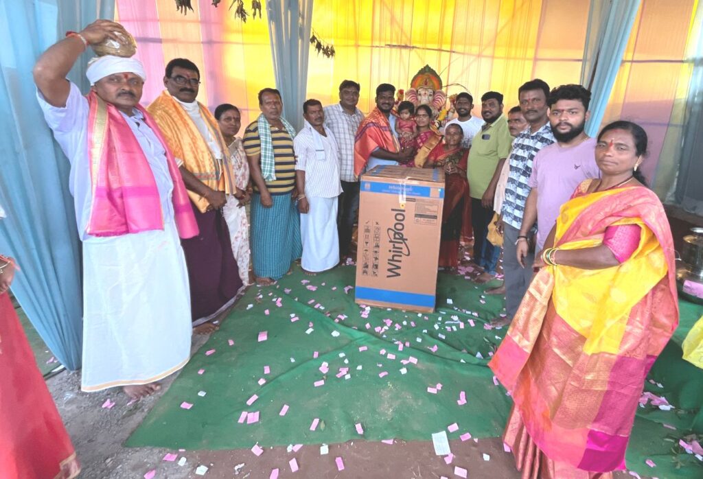 ఆర్.కె న్యూస్, నస్పూర్: నస్పూర్ పట్టణంలోని రామ్ నగర్ వీరాంజనేయ స్వామి దేవాలయంలో గణపతి నవరాత్రి వేడుకలు ఘనంగా నిర్వహించారు. వీరాంజనేయ స్వామి దేవాలయ ప్రాంగణంలో గణపతి నవరాత్రులు పురస్కరించుకుని నిర్వహించిన లక్కీ డ్రాలో కామెర కేశవి వాషింగ్ మిషన్, కే పద్మ లడ్డు ప్రసాదం దక్కించుకున్నారు. లక్కీ డ్రా విజేతలకు ఆలయ కమిటీ సభ్యులు వాషింగ్ మిషన్, లడ్డు ప్రసాదం అందజేశారు. లక్కీ డ్రాలో బహుమతి పొందటంతో విజేతలు హర్షం వ్యక్తం చేశారు.