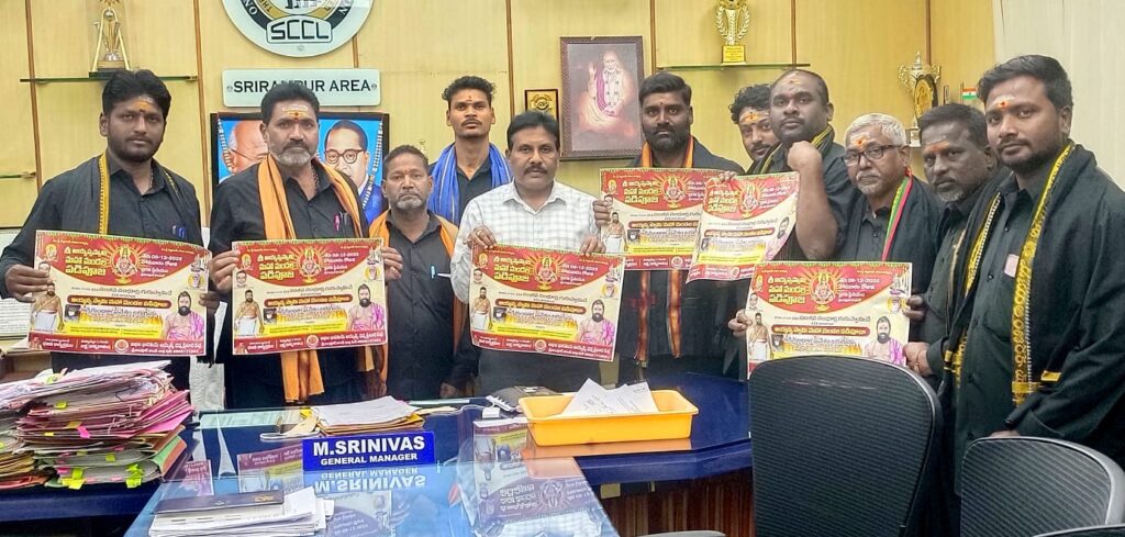 నస్పూర్ , ఆర్.కె న్యూస్: లోక కళ్యాణార్థం శ్రీరాంపూర్ లోని ప్రగతి స్టేడియంలో ఈ నెల 8న అయ్యప్ప స్వాముల మహా సంగమం, మహా పడిపూజ కార్యక్రమాన్ని నిర్వహిస్తున్నట్లు అఖిల భారతీయ అయ్యప్ప ధర్మ ప్రచార సభ శ్రీరాంపూర్ శాఖ నిర్వాహకులు తెలిపారు. ఈ కార్యక్రమానికి సంబంధించిన వాల్ పోస్టర్ ను బుధవారం శ్రీరాంపూర్ ఏరియా జీఎం ఎం.శ్రీనివాస్ ఆవిష్కరించారు. ఈ సందర్భంగా జీఎం శ్రీనివాస్, సంఘం అధ్యక్షులు బొడ్డు లక్ష్మణ్, వర్కింగ్ ప్రెసిడెంట్ వంగ శివ కుమార్, ప్రధాన కార్యదర్శి భాస్కరి రాజేశం మాట్లాడుతూ.. ఈ నెల 8న సాయంత్రం 6 గంటలకు కేరళకు చెందిన ప్రముఖ గురుస్వామి బ్రహ్మశ్రీ సంజీవ నంభూద్రి చేతుల మీదుగా అయ్యప్ప స్వామి మహా మండల పడిపూజ, అనంతరం అయ్యప్ప స్వాములచే అగ్ని ప్రవేశం (అగ్ని గుండాలు) కార్యక్రమం అత్యంత వైభవంగా జరుగుతుందని తెలిపారు. అదే రోజు సాయంత్రం 6 గంటలకు ఆర్కే-8 కాలనీలోని విఘ్నేశ్వర ఆలయం నుండి భారీ శోభాయాత్ర ప్రారంభమవుతుంది. ఇందులో 108 మంది మహిళలు హారతులతో, అయ్యప్ప భక్తుల పేటతుల్లి నృత్యాలు, నగర సంకీర్తనలతో.. అయ్యప్ప, గణపతి, కుమారస్వామిల చిత్రపటాలతో ఊరేగింపు నిర్వహించనున్నారు. ఈ యాత్ర ఆర్కే-6 గుడిసెలు, గాంధీనగర్, హిమ్మత్ నగర్ మీదుగా ప్రగతి స్టేడియం వరకు సాగుతుంది. మధ్యాహ్నం 1 గంటకు అయ్యప్ప స్వాములు, భక్తులకు భిక్షా (అన్నదానం) కార్యక్రమం ఏర్పాటు చేసినట్లు నిర్వాహకులు తెలిపారు. ఈ జిల్లా స్థాయి మహా సంగమానికి ఉమ్మడి ఆదిలాబాద్, కరీంనగర్ జిల్లాల నుంచే కాకుండా మహారాష్ట్రలోని సిరివంచ నుండి కూడా వేలాదిగా అయ్యప్ప స్వాములు హాజరుకానున్నారు. ఈ కార్యక్రమంలో అఖిల భారతీయ అయ్యప్ప ధర్మ ప్రచార సభ శ్రీరాంపూర్ ఏరియా ఉపాధ్యక్షులు చకిలం శ్రావణ్ చింటు, కార్యదర్శి పడాల లింగయ్య, దాసరి నవీన్, జమాల్ పూర్ శ్రావణ్, తళాల శివ, ఆనకారి హరీష్, ప్రసాద్, నాతాడి కొండాల్ రెడ్డి, దాసరి కళ్యాణ్, తాటిపాముల సత్యనారాయణ, జక్కెన రమేష్, ఎగ్గడి వినోద్ కుమార్, మాటూరి వంశీ, ఆడేటి అశోక్, సాత్విక్ తదితరులు పాల్గొన్నారు.