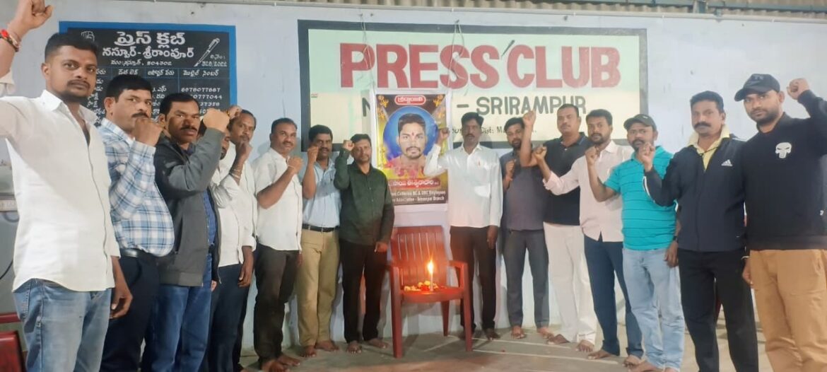 నస్పూర్, ఆర్.కె న్యూస్: 42 శాతం బీసీ రిజర్వేషన్ ఉద్యమం కోసం ఆత్మబలిదానం చేసుకున్న సాయి ఈశ్వర చారికి సింగరేణి బీసీ ఎంప్లాయిస్ అసోషియేషన్ ఆధ్వర్యంలో సోమవారం సాయంత్రం నస్పూర్ ప్రెస్ క్లబ్ ప్రాంగణంలో శ్రద్ధాంజలి ఘటించారు. అసోషియేషన్ నాయకులు సాయి ఈశ్వర చారి చిత్రపటం వద్ద కొవ్వొత్తి వెలిగించి, పుష్పాంజలి ఘటించి నివాళులు అర్పించారు. ఈ సందర్భంగా వారు మాట్లాడుతూ.. బీసీ రిజర్వేషన్ లక్ష్య సాధన కోసం తమ ప్రాణాలను అర్పించిన సాయి ఈశ్వర చారి త్యాగం మరువలేనిదని కొనియాడారు. ఆయన ఆశయాన్ని సాధించే వరకు బీసీ ఉద్యమాన్ని కొనసాగిస్తామని వారు పునరుద్ఘాటించారు. ఈ కార్యక్రమంలో సింగరేణి బీసీ ఎంప్లాయిస్ అసోసియేషన్ శ్రీరాంపూర్ బ్రాంచ్ నుండి ఉపాధ్యక్షులు శ్రీనివాస్, బ్రాంచ్ కార్యదర్శి బరుపటి మారుతి, ట్రెజరర్ బద్రి బుచ్చయ్య, నాయకులు రఘురాం, మల్లేష్, రాందాస్, వెంగళ కుమారస్వామి, నరేష్, మదన్ తో పాటు అసోషియేషన్ సభ్యులు తదితరులు పాల్గొన్నారు.