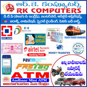 డిటిపి, కలర్ జిరాక్స్, లామినేషన్, ఇంటర్నెట్, ఆన్ లైన్ అప్లికేషన్స్, పాన్ కార్డ్ సర్వీస్, క్యాష్ విత్ డ్రా, మనీ ట్రాన్స్ ఫర్, ఆధార్ డౌన్ లోడ్, పివిసి ఐడి కార్డ్స్, జీవన్ ప్రమాన్ (డిజిటల్ లైఫ్ సర్టిఫికెట్), ఐటి రిటర్న్స్ ఈ-ఫైలింగ్, నోటరీ, స్టాంప్ (బాండ్) పేపర్స్ లభించును, వెహికిల్ ఇన్సూరెన్స్, వాయిస్ ఓవర్ సర్వీస్, బస్ & ట్రైన్ టికెట్ బుకింగ్, స్పైరల్ బైండింగ్, Paytm KYC.